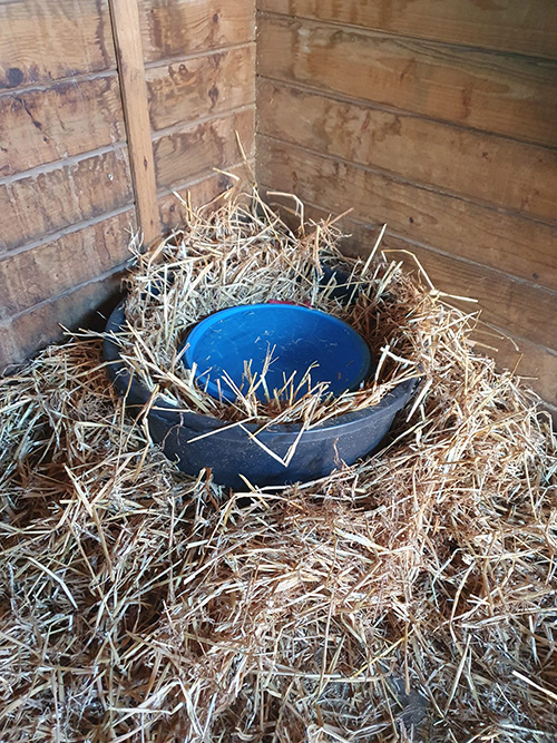 We hebben de dierenweide winterklaar gemaakt. Het water voor de dieren mag natuurlijk niet bevriezen. Daar nemen we allerlei maatregelen voor, zoals het inpakken van een waterbak in een laag stro.