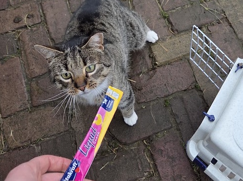 Terug bij de dierenweide mocht Tijgertje weer uit zijn mandje. Na dit avontuur was de verwachting dat hij zich wel even uit de voeten zou maken. Maar het tegendeel bleek waar; hij wilde nog lekker geaaid worden en nam gretig een kattensnack aan.