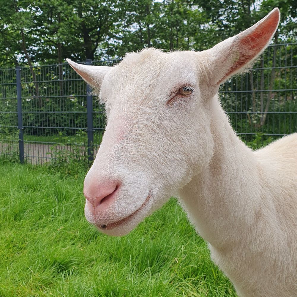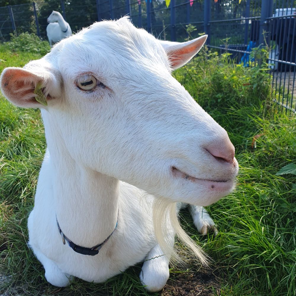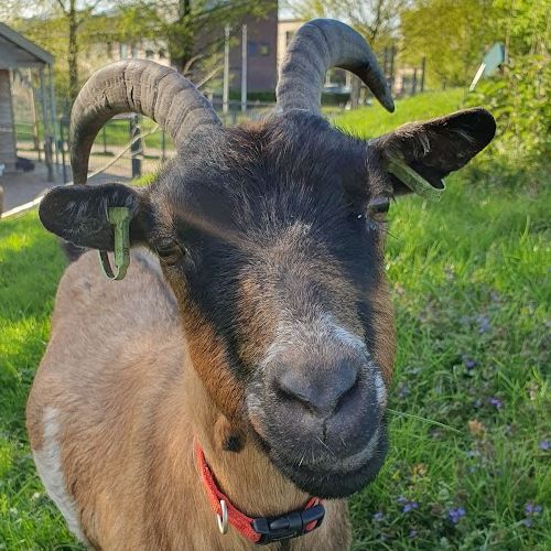 ![]() | Renske (2014), een lief bruin dwerggeitje, geboren op Eilandsteede en de dochter van Iza. Je kunt haar herkennen aan een wit vlekje op de rechterflank. |